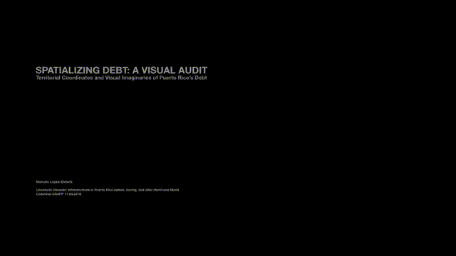 The project Spatializing Debt: A Visual Audit was presented at Columbia GSAPP after an invitation by the Buell Center for the Study of American Architecture from the Graduate School of Architecture, Planning and Preservation from Columbia University during the panel Unnatural Disaster: Infrastructure in Puerto Rico before, during, and after Hurricane Maria on November 9, 2018.