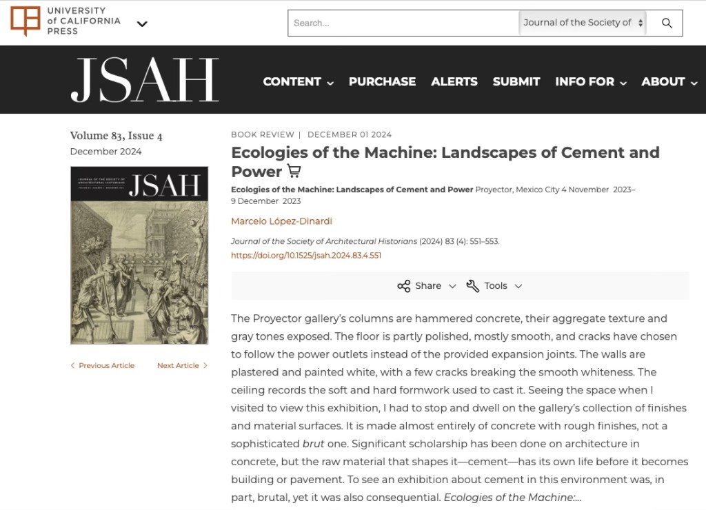My review of the exhibition, Ecologies of the Machine: Landscapes of Cement and Power, led by Erika Loana and Kim Förster with Tania Tovar from the gallery Proyector in Mexico City is out in the Journal of the Society of Architectural Historians.
